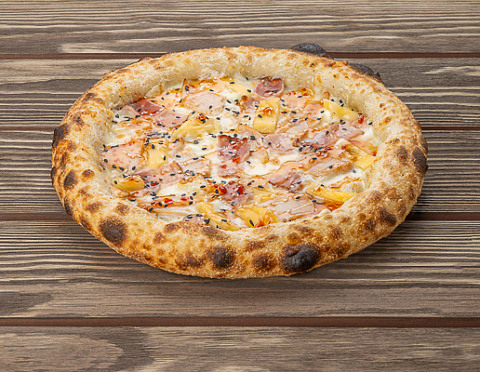 Соус белый, моцарелла, бекон, курица, ананас, сладкий чили, кунжут.