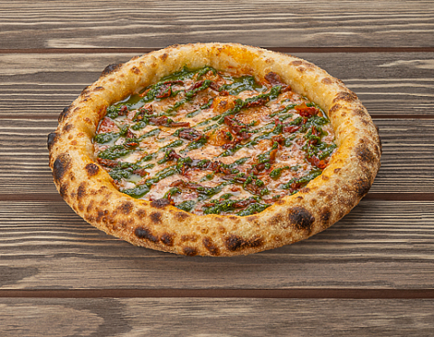Соус красный, моцарелла, оливковое масло, базилик, песто, вяленые томаты.