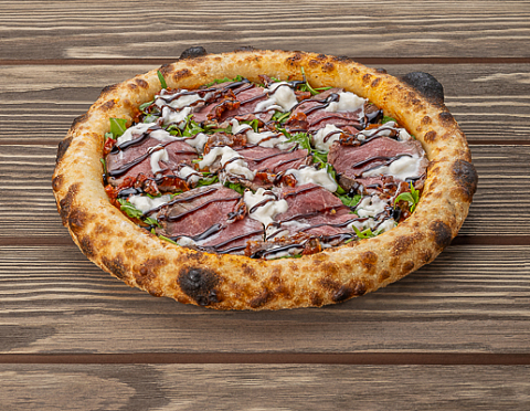 Соус томатный, свежая руккола, ростбиф, вяленые томаты, страчателла, бальзамик.
