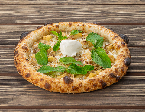 Сыр моцарелла, яблоки, белый соус, корица, мята, мороженное, карамельный топпинг.