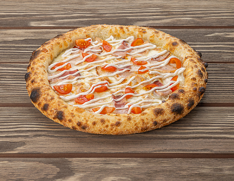 Куриная грудка, бекон, томаты, соус цезарь, сыр моцарелла.