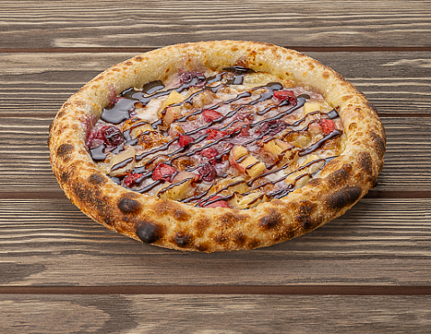 Сыр моцарелла, джем, вишня, клубника, ананас, шоколадный топпинг.