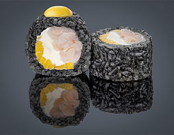 Чернила каракатицы, двойная порция креветок, авокадо, икра тобико, соус спайси, соус унаги, творожный сыр Cremette Professional.