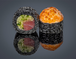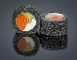 Чернила каракатицы, лосось, огурчик, оранжевая икра тобико, творожный сыр Cremette Professional.