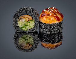 Лосось, угорь(допускается попадание мелких костей), огурчик, творожный сыр Cremette Professional.