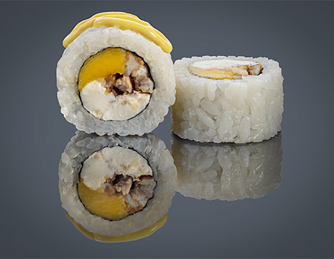 Чернила каракатицы, двойная порция угря(допускается попадание мелких костей), манго, творожный сыр Cremette Professional.